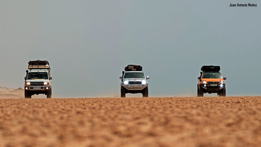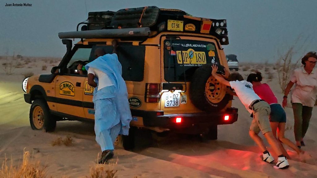 Al anochecer, una especie de meharista solitario nos recomendó salir al asfalto y llegar a Chami para poder dormir en algún albergue. Nadie dudó de la sabiduría de estos señores del desierto, por lo que seguimos sus consejos, no sin antes desatascar algunos vehículos succionados por una arena tan fina como la harina.