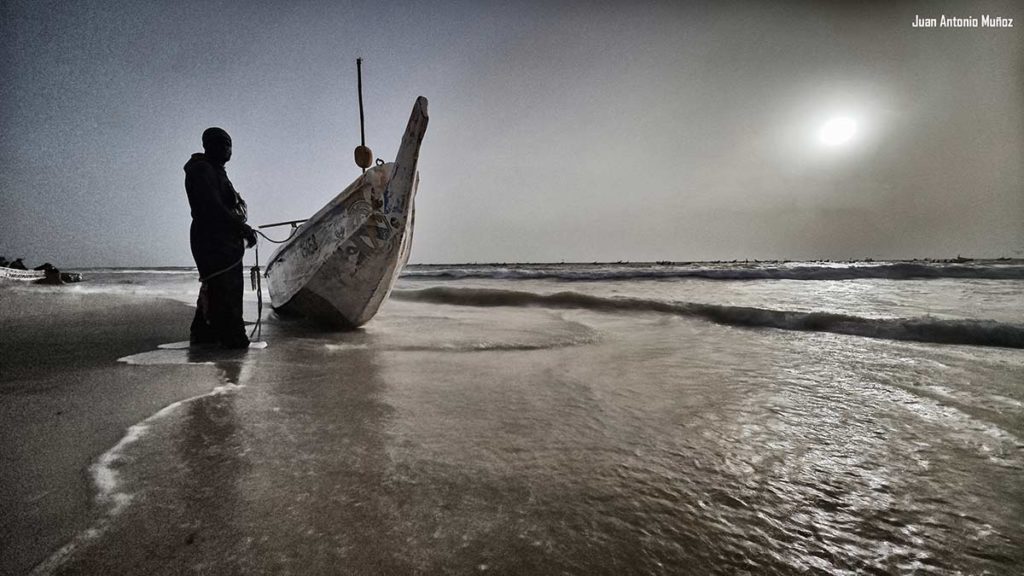 En las cercanías de Nouakchott hicimos un alto en una de las playas solitarias de la costa mauritana. Cobijado en una pequeña jaima o tienda improvisada, sorprendimos a un pescador protegido del sol bajo las telas multicolores. Es un imraguen, que en bereber significa pescador. Son considerados los últimos grandes pescadores del Sáhara.