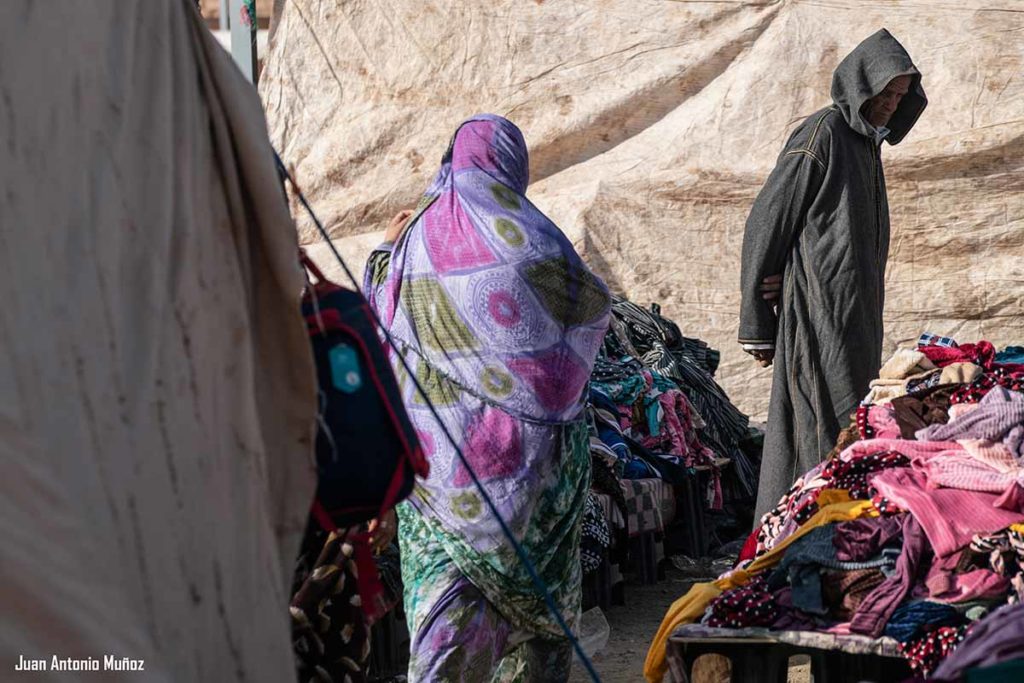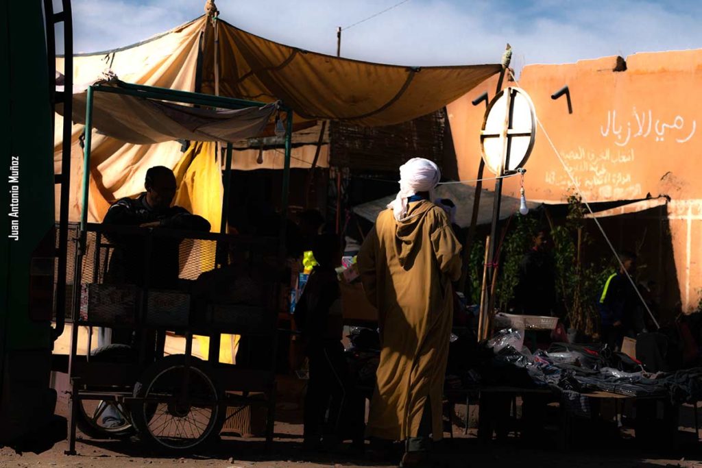 Carromatos tirados por burros y mulas; bicicletas; furgonetas abigarradas de un sinfín de productos; personajes envueltos en turbantes; velos y chilabas, van llegando al centro de Tagounite. Es jueves y día de mercado en esta pequeña población al sur del Valle del Draa en Marruecos. La peculiar peregrinación va entrando en el recinto del zoco con el fin de aprovisionarse de alimentos o vestimentas a un precio mucho más asequible que en las tiendas habituales.